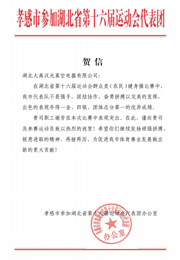 下圖為湖北省第十六屆運(yùn)動(dòng)會(huì)代表團(tuán)辦公室發(fā)來的感謝信!